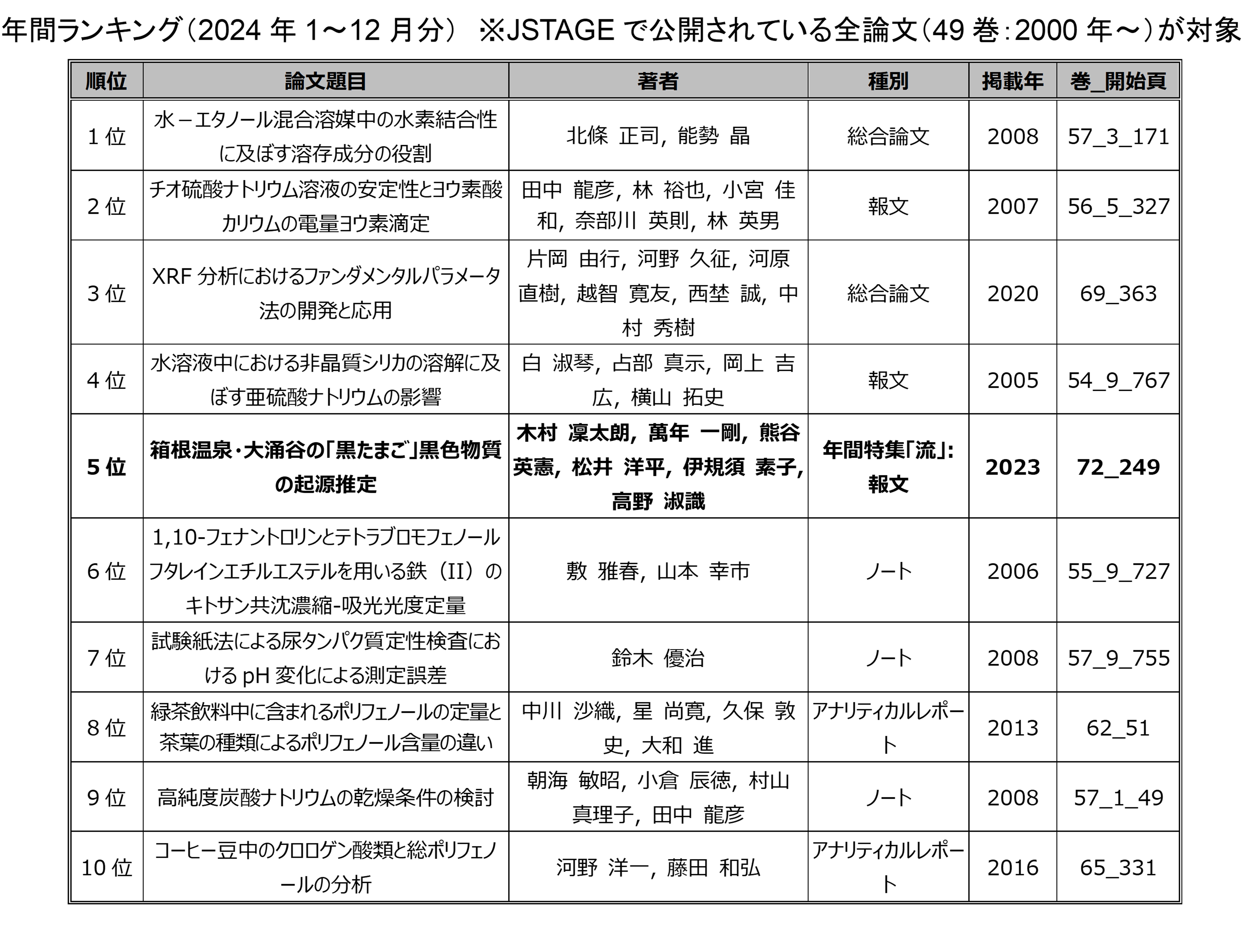 ここでのランキングはJ-Stage「分析化学」のホームページに掲載されているもの とは集計方法が異なりますので結果が異なっています.このランキングはアクセス数を水増し するために同じサイトから何度もアクセスしたり、PDFダウンロード時にネット上の遅延など で複数回ダウンロードボタンをクリックしてしまい、結果として複数回ダウンロードして しまうなど、過剰回数のアクセスによる"アクセス数増大"を防ぐため、一月あたりの 一IPアドレスからは1論文1回のアクセスを上限としてカウントしています.