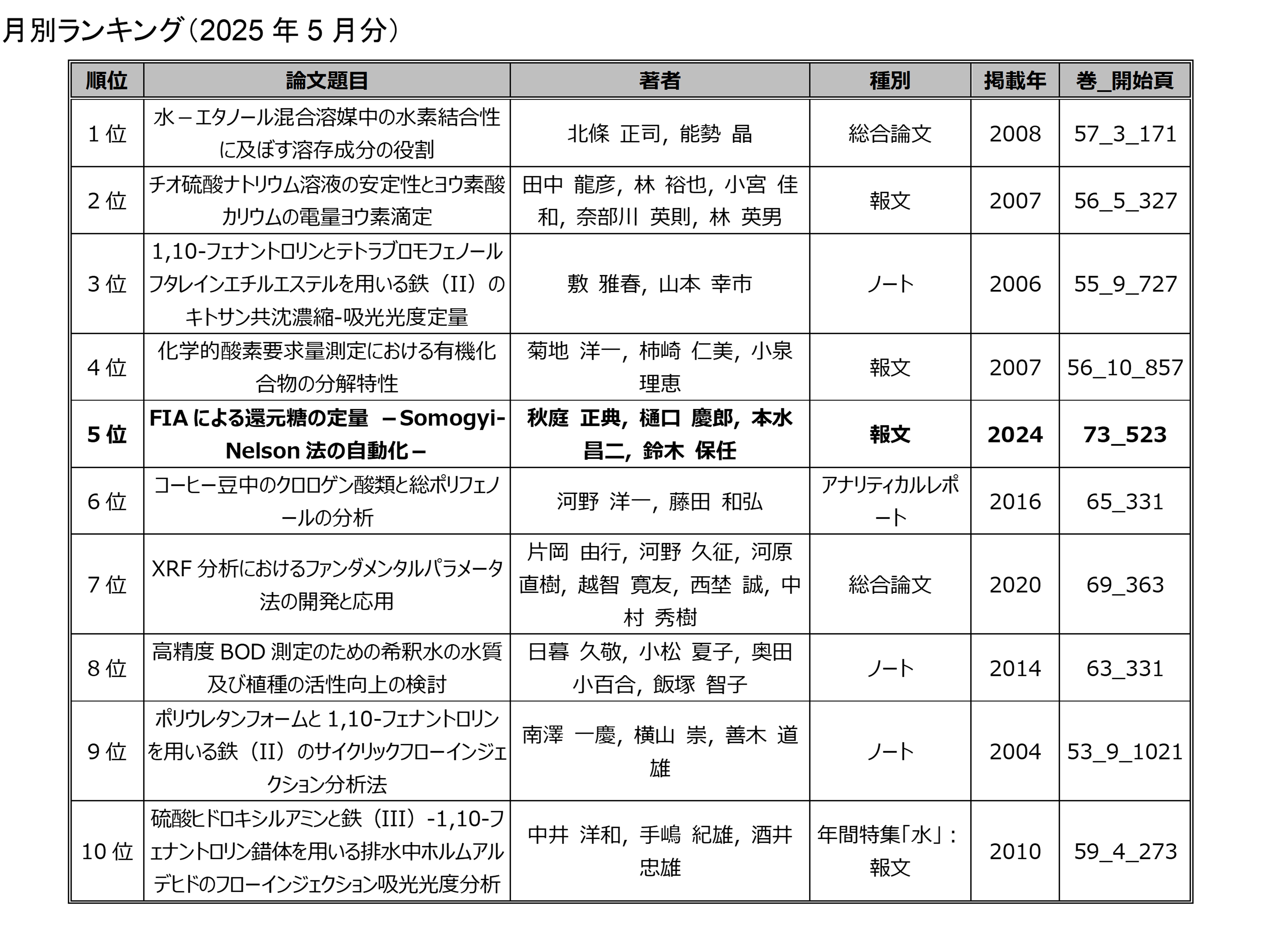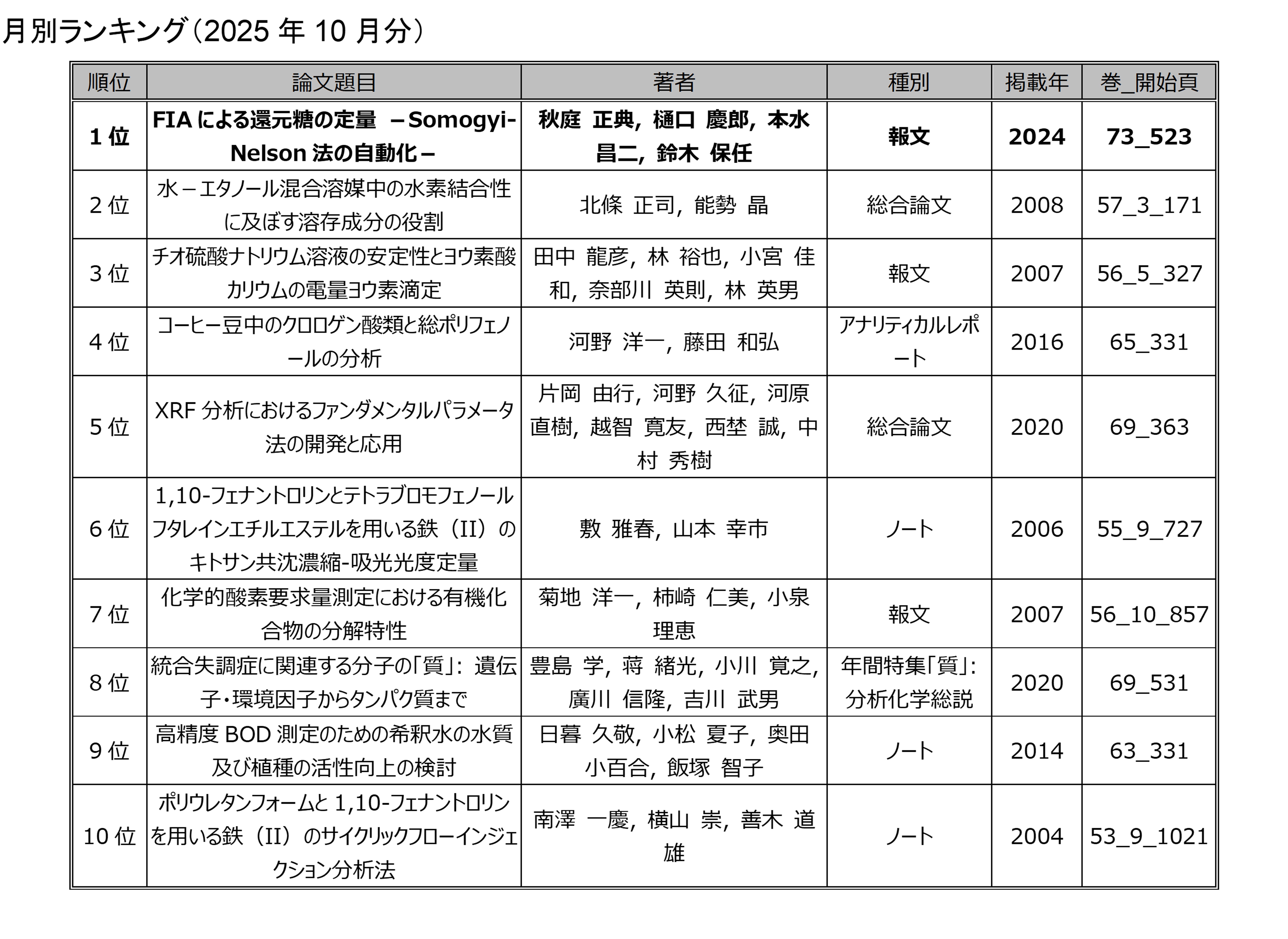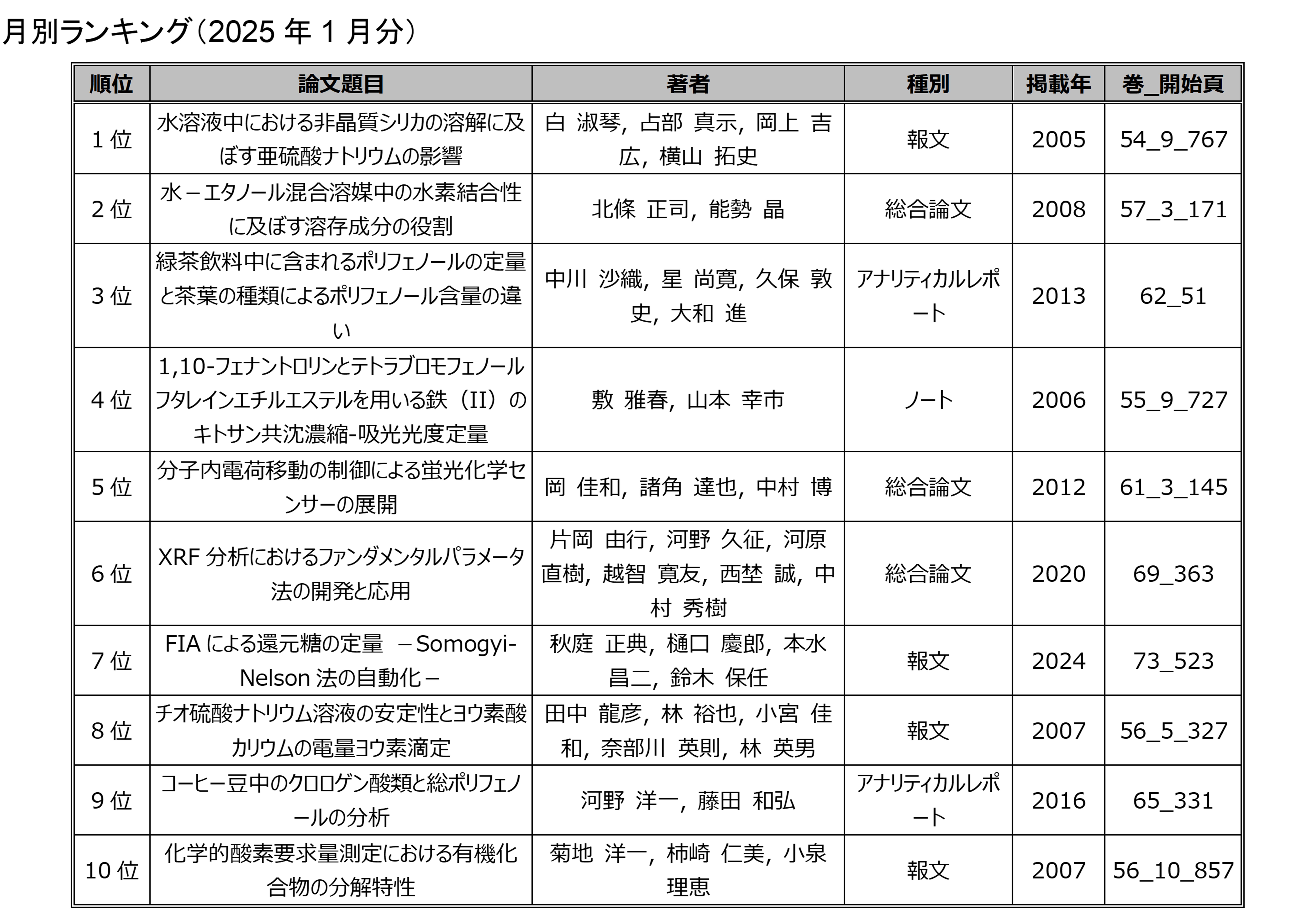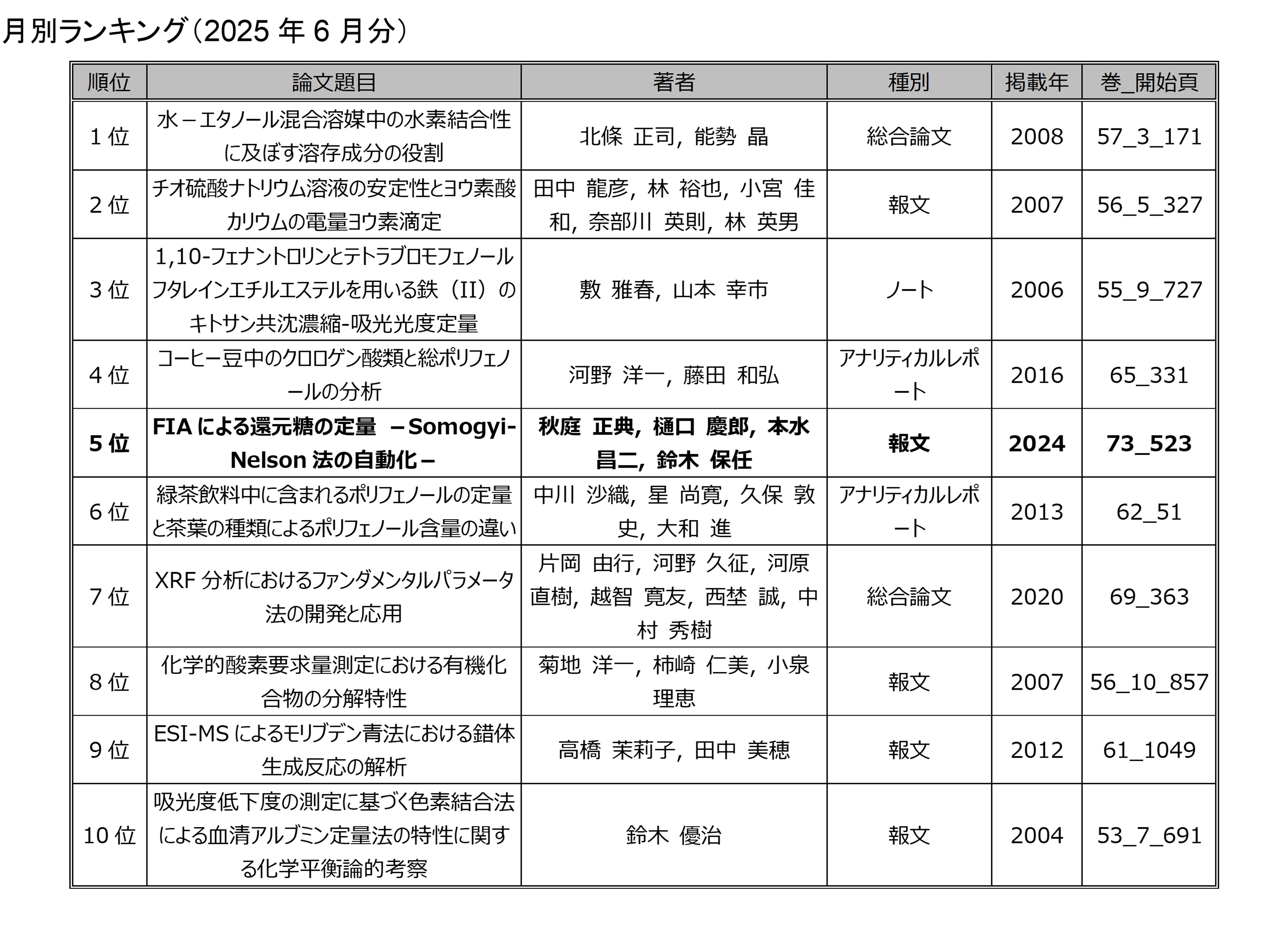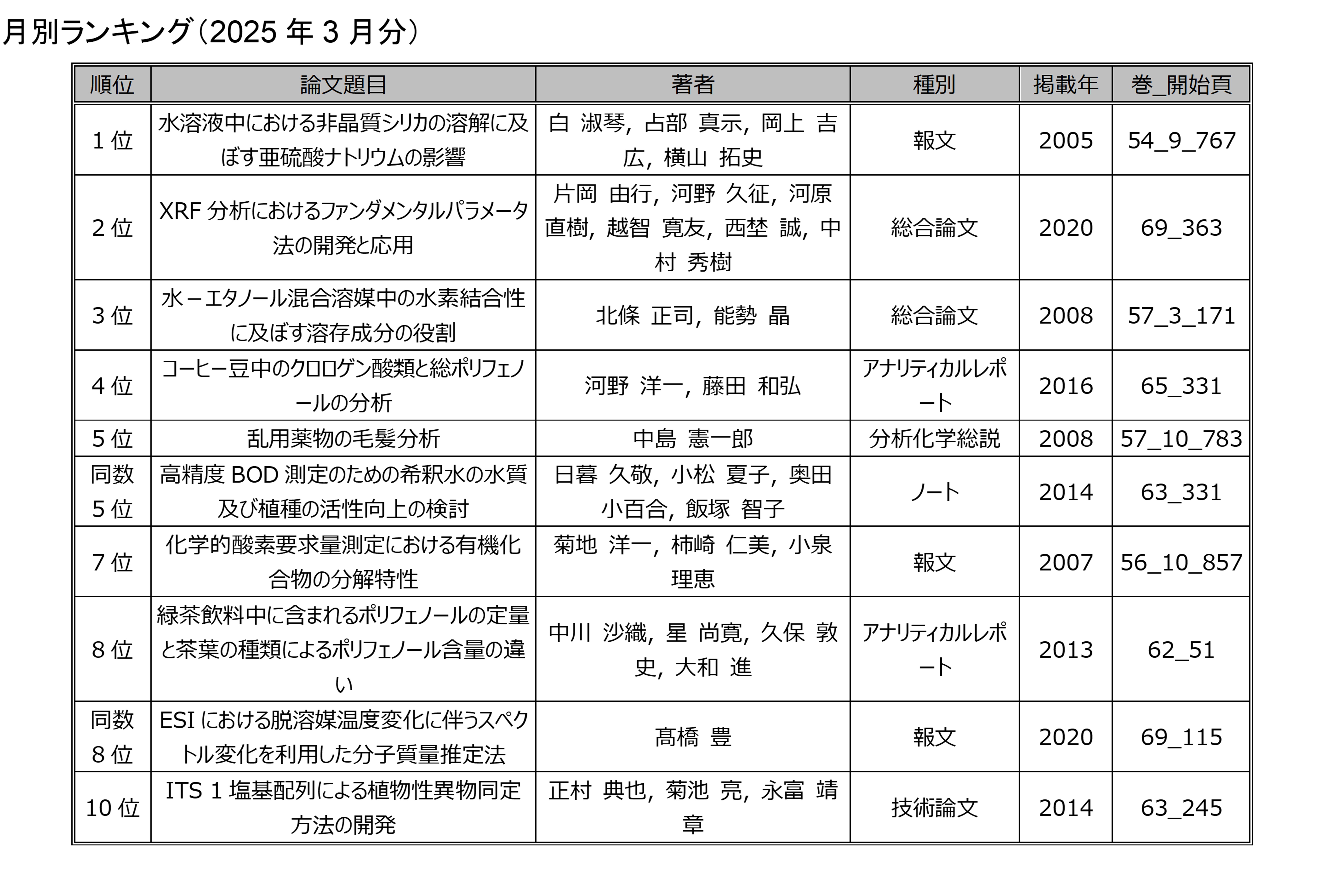 「分析化学」の電子ジャーナルにアクセスした回数を論文毎に毎月集計したランキングです.
