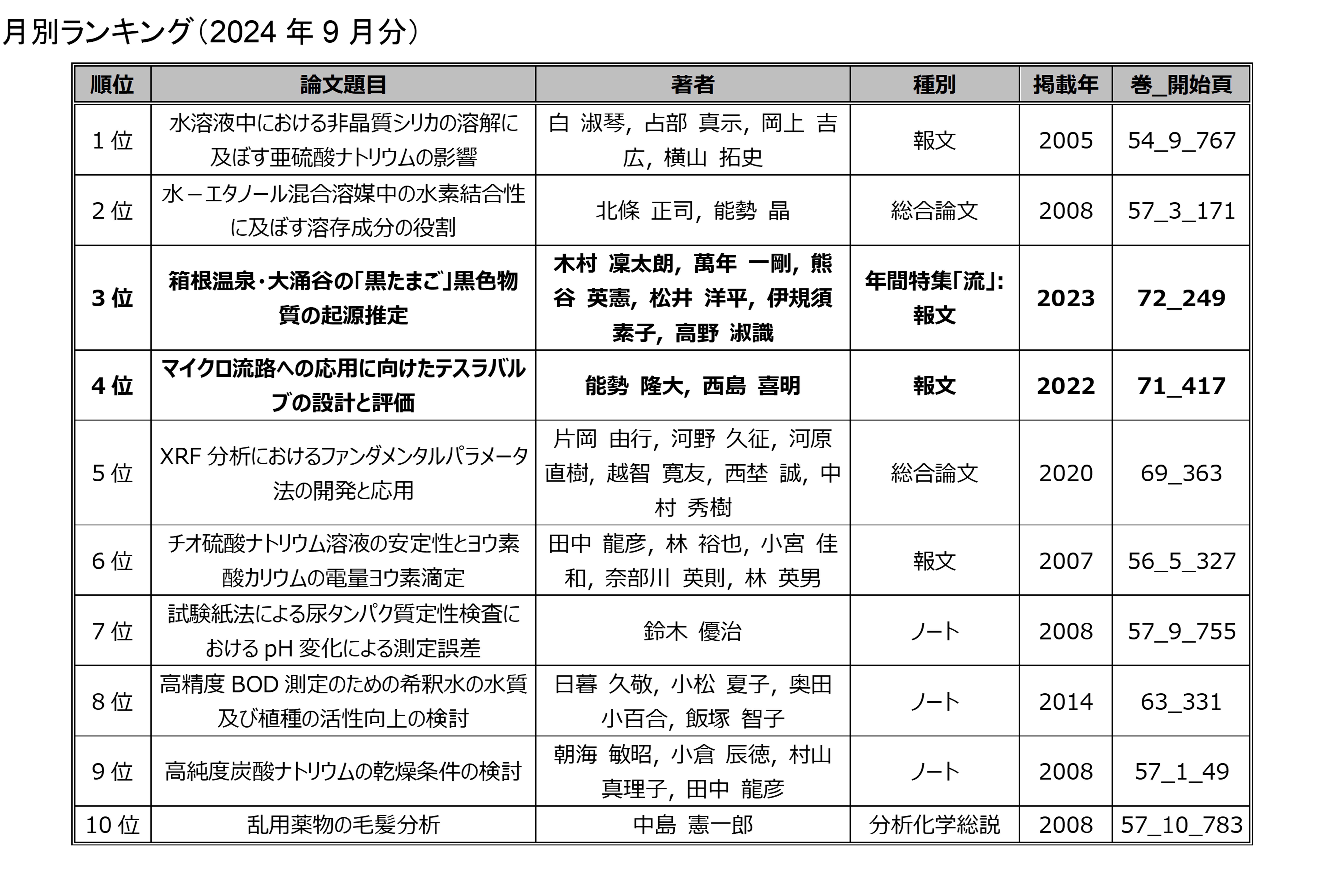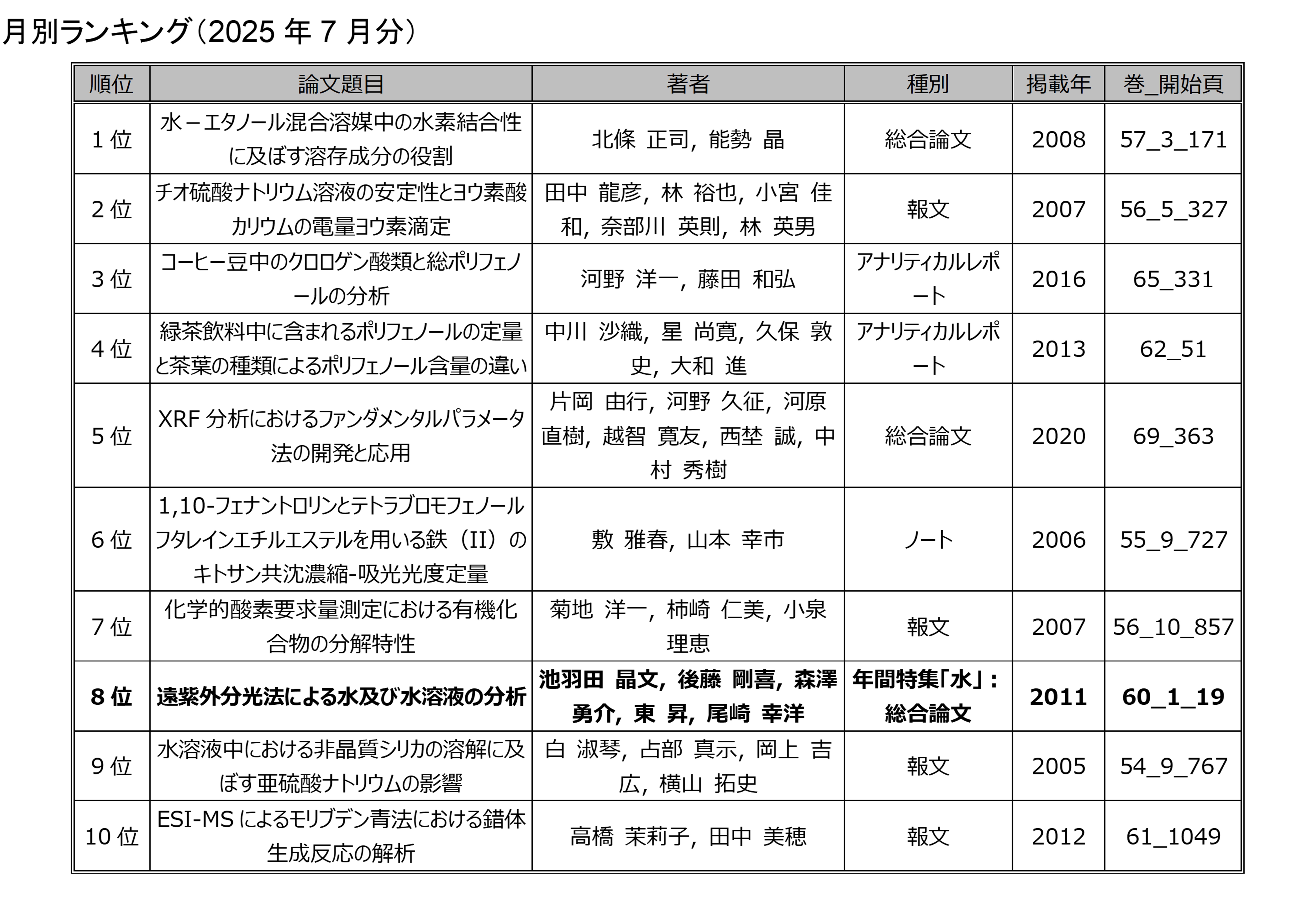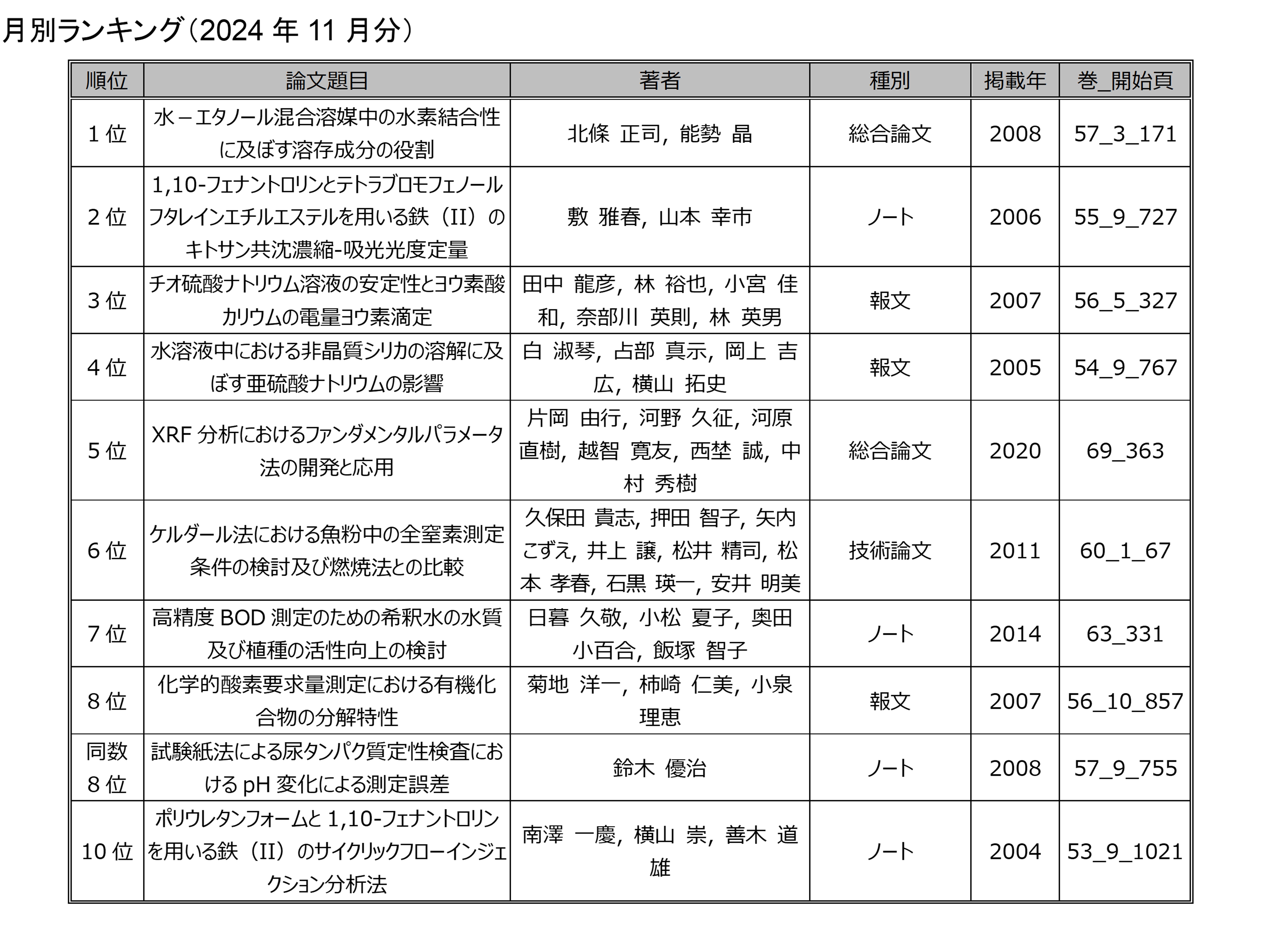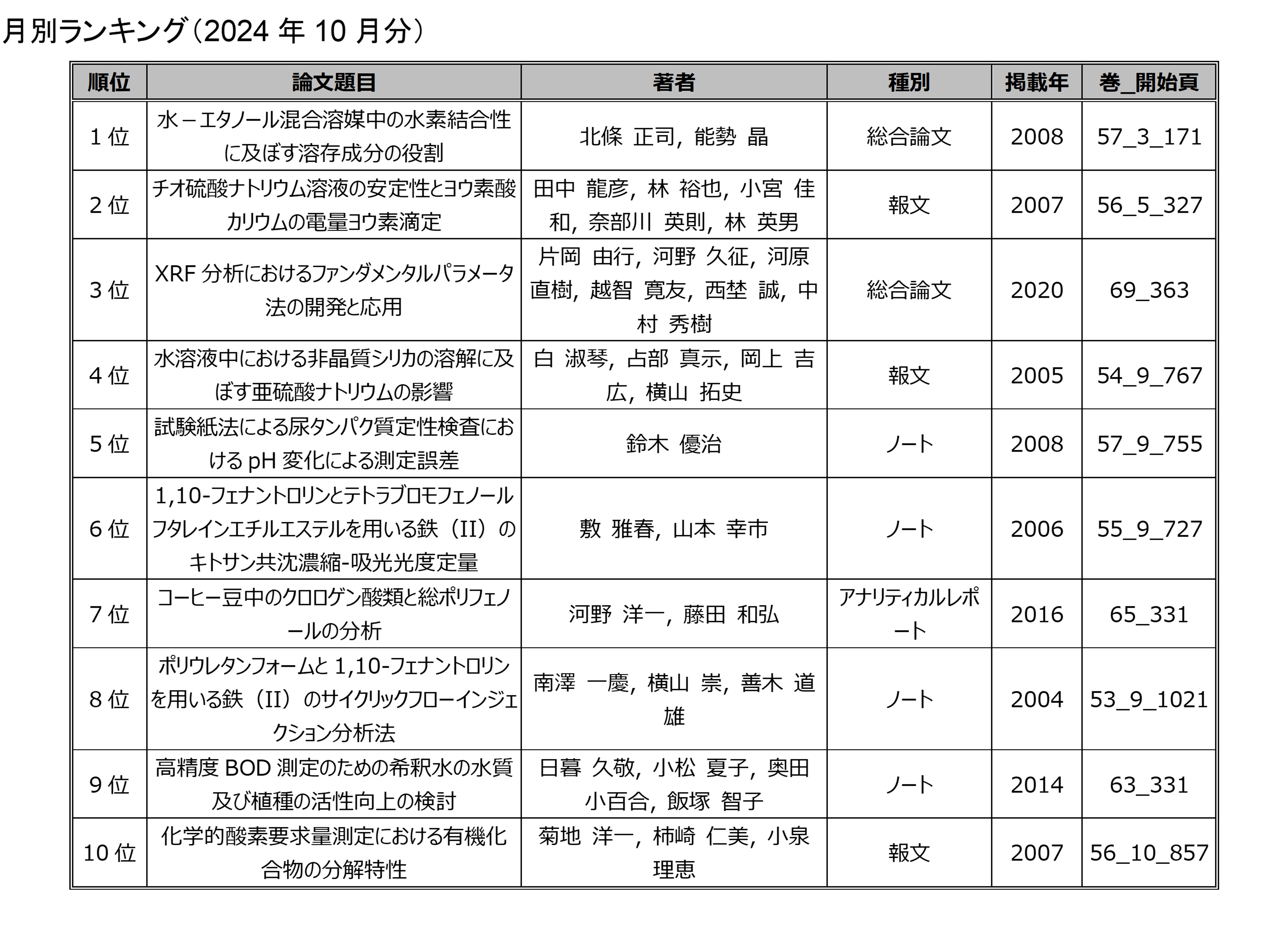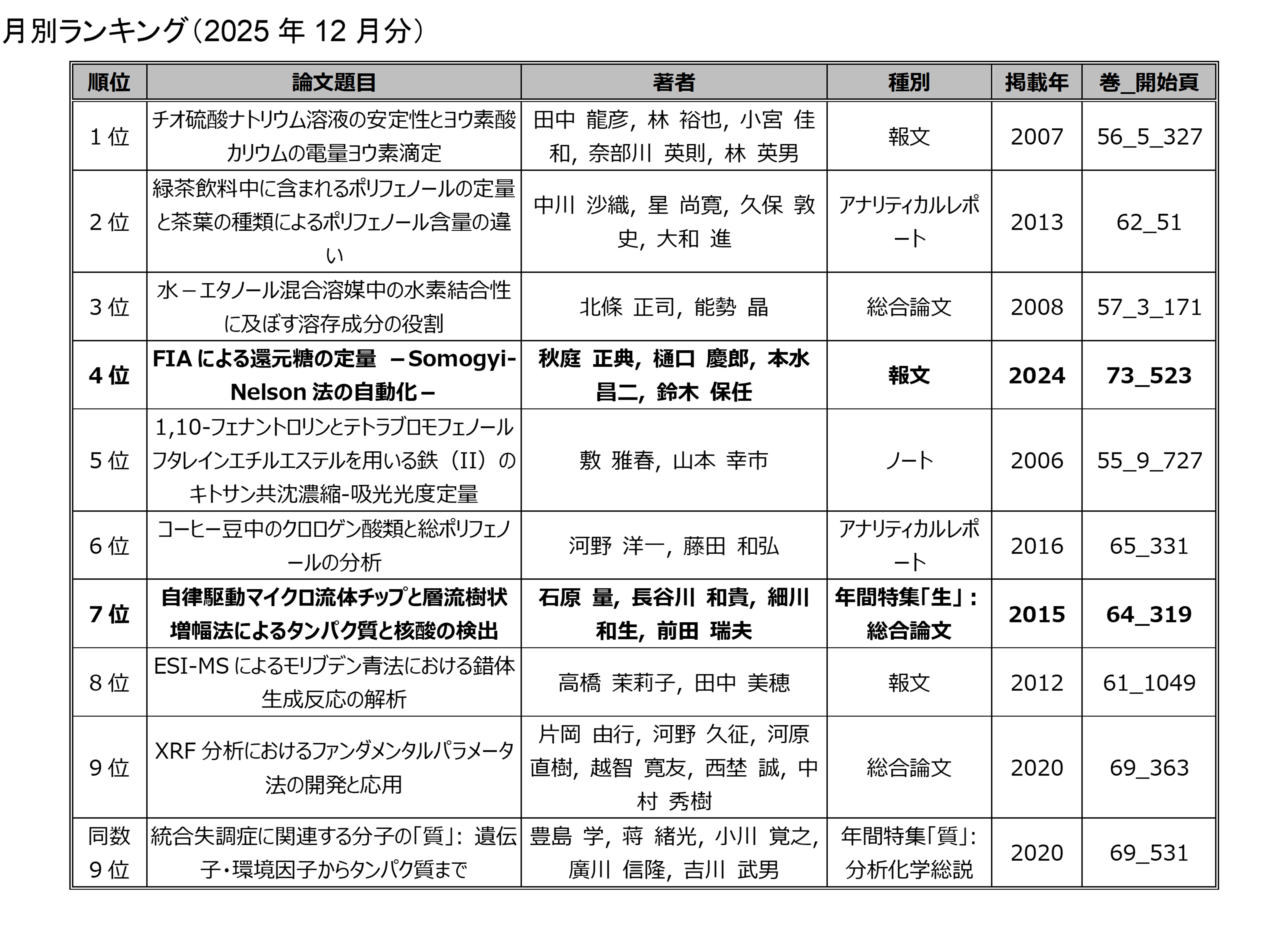 「分析化学」の電子ジャーナルにアクセスした回数を論文毎に毎月集計したランキングです.